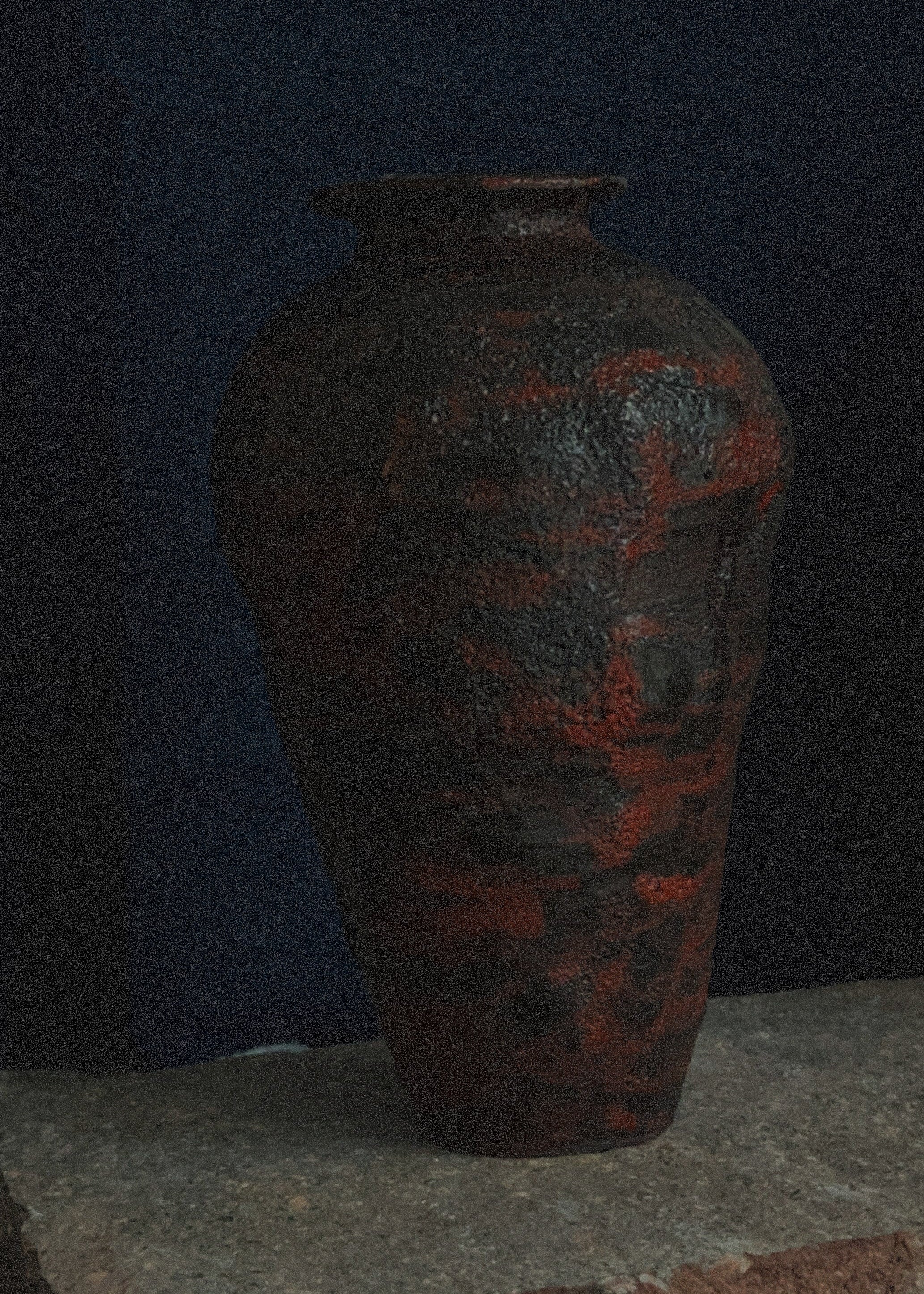 Dark in tone, with deep red hues. The form carries a sense of weight and stillness. Its uneven surface catches light subtly, suggesting moisture and layered depth.