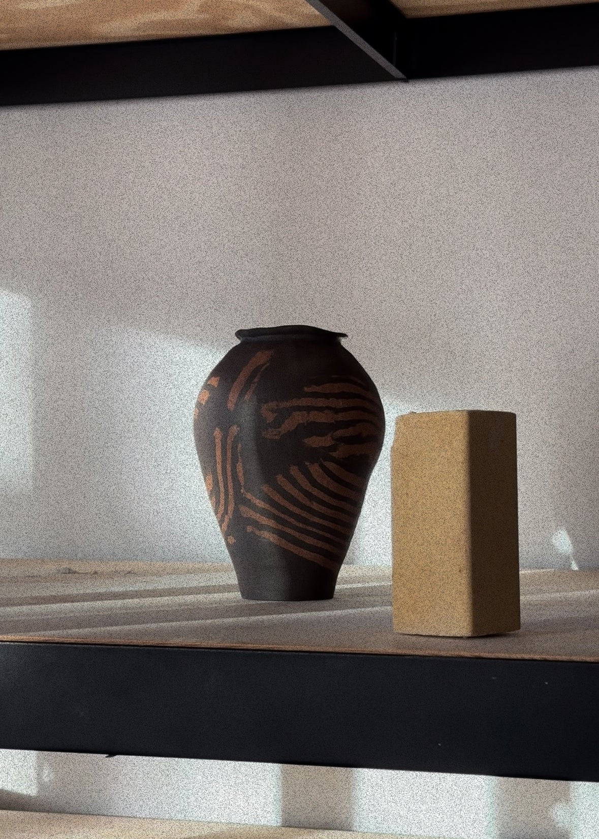 Terrain is a ceramic vessel formed through the nerikomi technique, where brown clay lines are embedded within a black clay body. The surface reads like a cross-section of land—layered, shifting, and irregular. Each line follows its own path, creating a quiet rhythm that speaks to pressure, movement, and time held within the form.